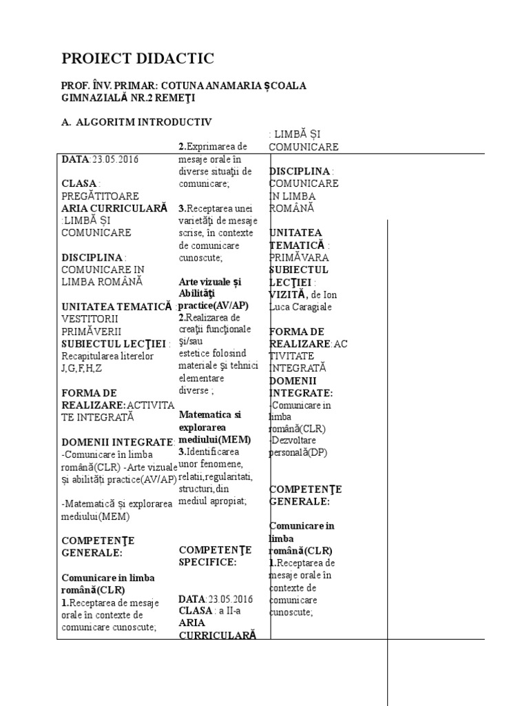 Proiect Didactic Prof Inv Primar Cotuna Anamaria școala