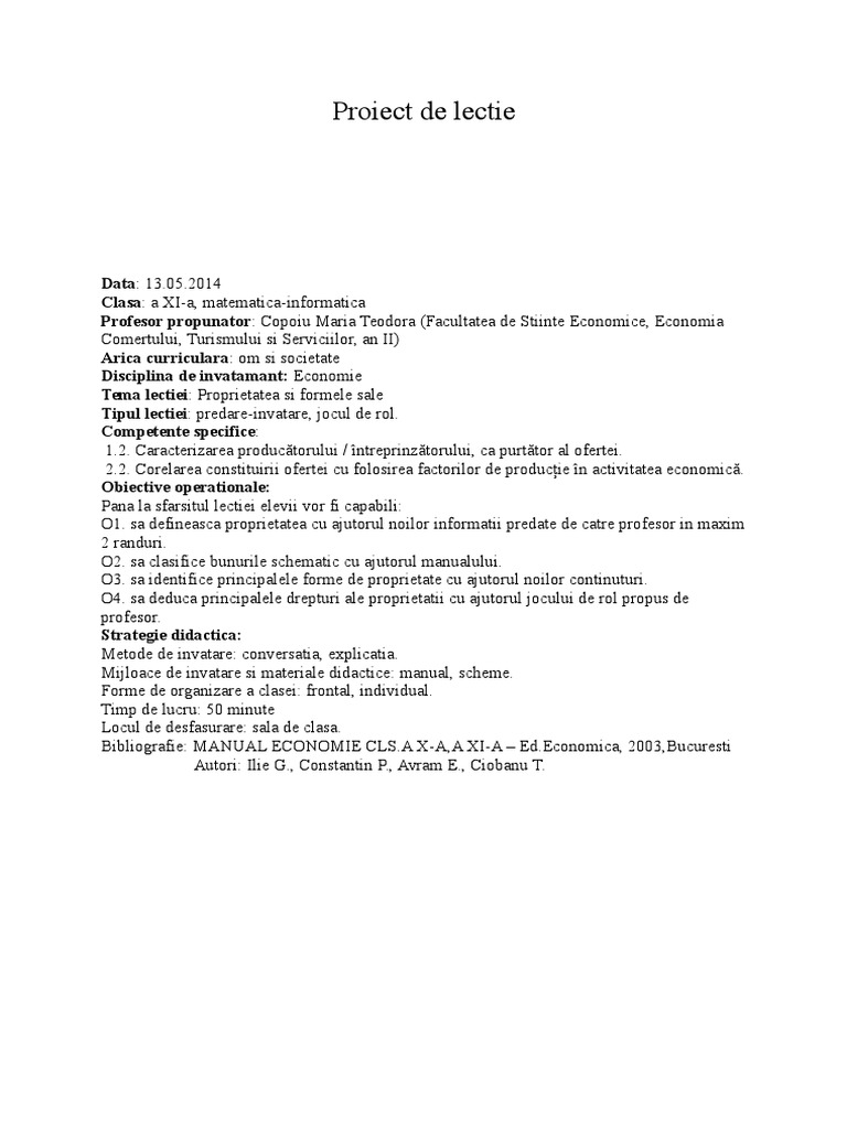 Proiect De Lectie Economie Proprietatea Si Formele Sale