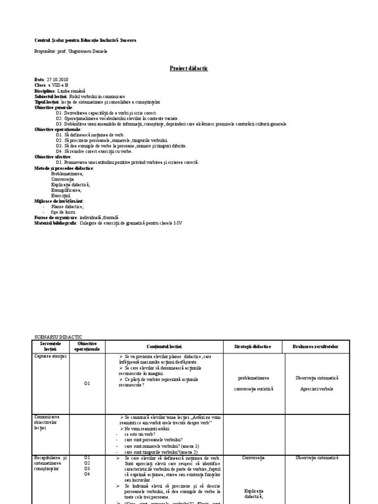 Verbul Nucleul Comunicarii Proiect De Lectie